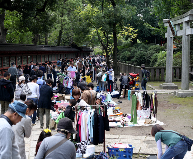 50店ものフリーマーケットが出て、大勢の客が真剣な表情で掘り出し物を探している。まとめて購入して随分値切っている人もいる。昼頃には大変な人出になっていた。